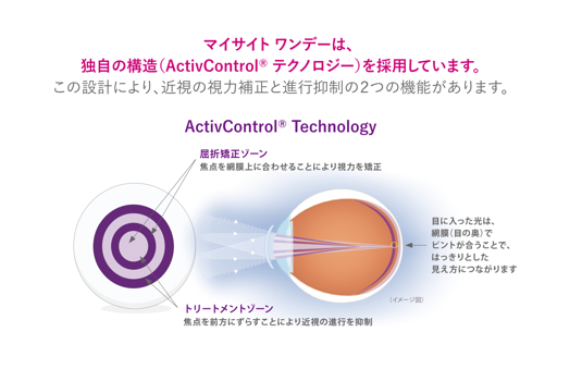 マイサイトワンデー日本初承認の近視進行抑制治療のための1dayタイプのソフトコンタクトレンズです。従来の近視の矯正+近視進行抑制効果を同時に行う、というのが特徴です。