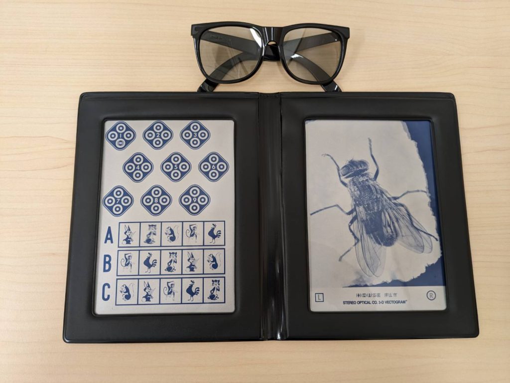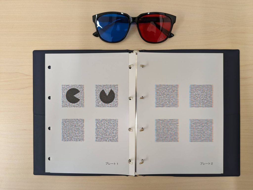 “3Dの飛び出す絵本”を専用の眼鏡をかけて立体視の検査を行い、両眼視機能を測定します。